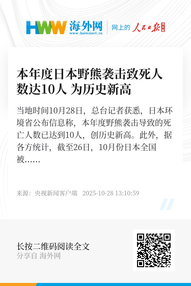 当地时间10月28日,总台记者获悉,日本环境省公布信息称,本年度野熊袭击导致的死亡人数已达到10人,创历史新高。