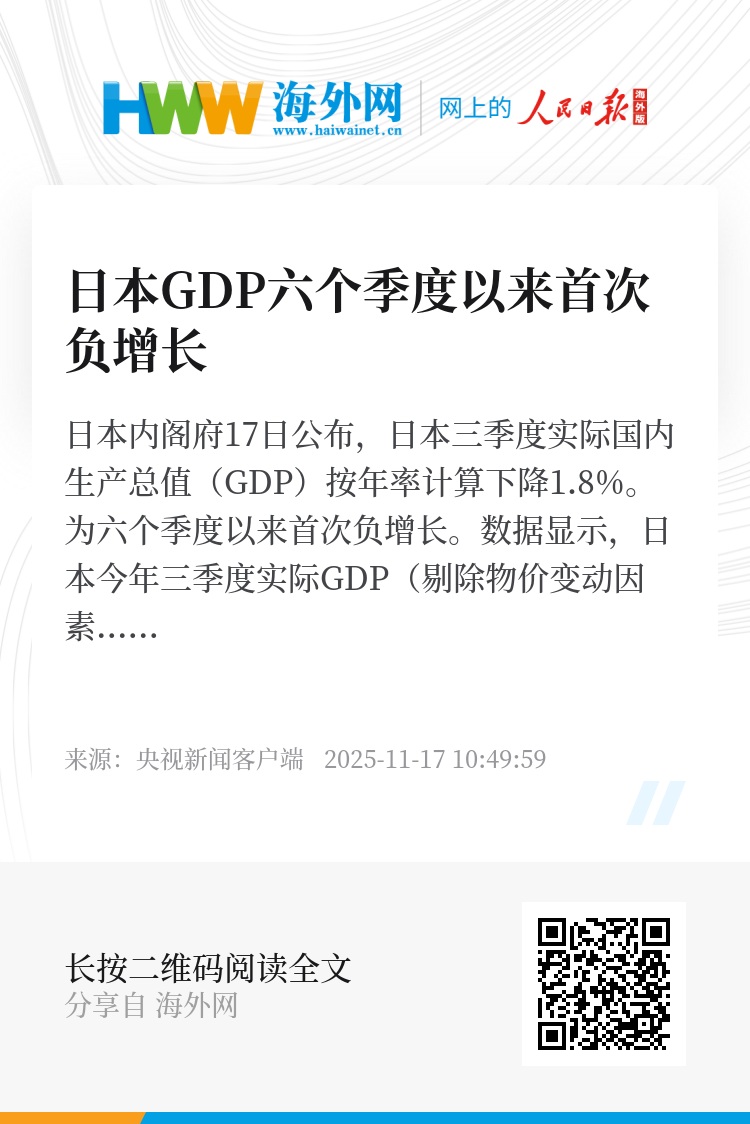 日本内阁府17日公布,日本三季度实际国内生产总值(GDP)按年率计算下降1.8%。为六个季度以来首次负增长。
