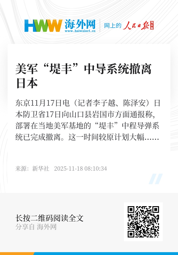 新华社东京11月17日电(记者李子越、陈泽安)日本防卫省17日向山口县岩国市方面通报称,部署在当地美军基地的“堤丰”中程导弹系统已完成撤离。这一时间较原计划大幅延后。