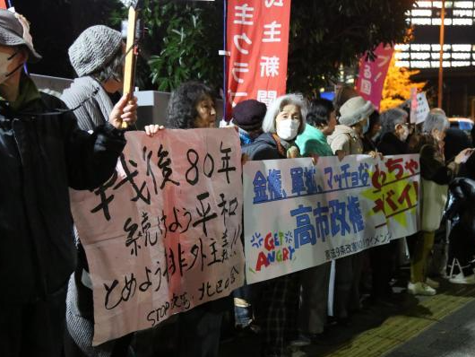 本次集会于当地时间25日18时30分开始。抗议者们举着写有“立即撤回高市言论”“不要将国民卷入战争”“金权、军扩,强横的高市政权十分糟糕”等标语的牌子,高喊“撤回错误涉台言论”“高市下台”等口号,要求高市对其涉台言论负责并辞去首相职务。