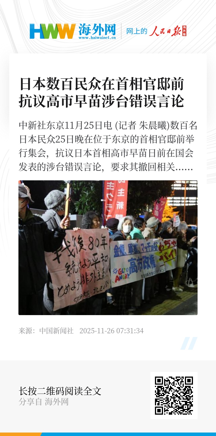 中新社东京11月25日电 (记者 朱晨曦)数百名日本民众25日晚在位于东京的首相官邸前举行集会,抗议日本首相高市早苗日前在国会发表的涉台错误言论,要求其撤回相关表态。