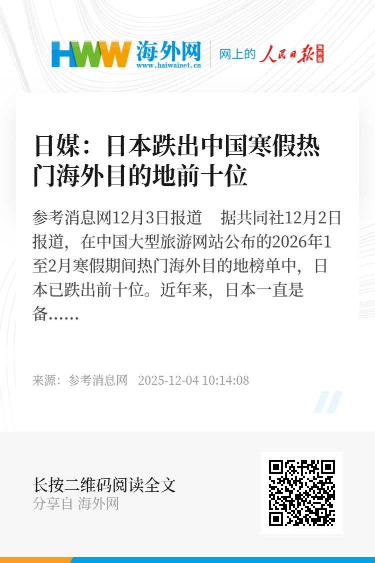 参考消息网12月3日报道 据共同社12月2日报道,在中国大型旅游网站公布的2026年1至2月寒假期间热门海外目的地榜单中,日本已跌出前十位。近年来,日本一直是备受中国游客欢迎的热门旅游目的地之一,并曾在今年10月的长假期间位列热门首选。