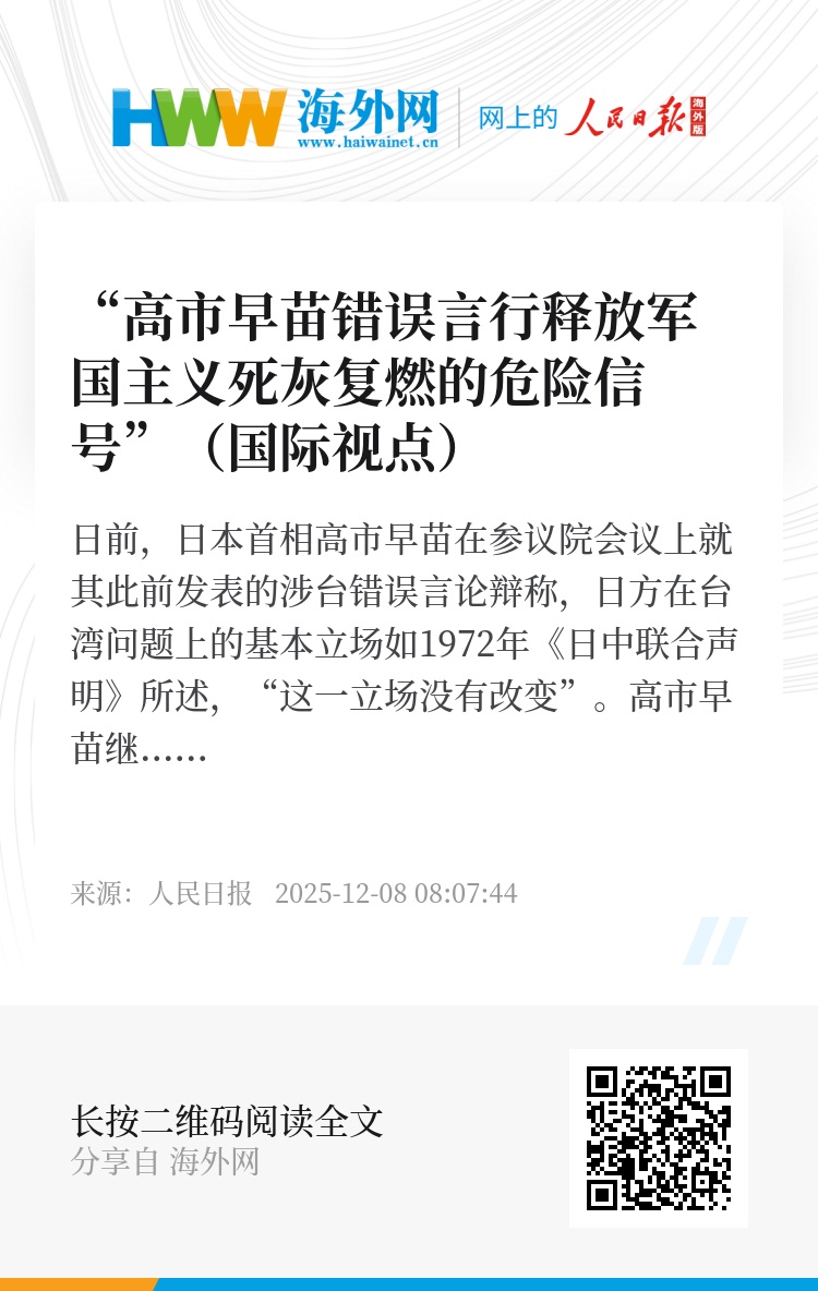 高市早苗先是妄称“台湾有事可能对日本构成存亡危机事态”,后又妄图煽炒所谓“台湾地位未定论”。此后高市早苗辩称其立场“符合日本政府一贯立场”“立场没有任何改变”等,拒绝撤回错误言论。