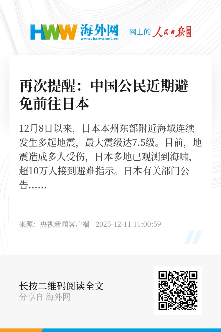 外交部和中国驻日本使领馆提醒中国公民近期避免前往日本,在日同胞密切关注地震及次生灾害预警信息,遵循当地避难指令,加强自身安全防范,远离海边等高风险地区。如遇紧急情况,请及时报警并联系驻日使领馆寻求协助。