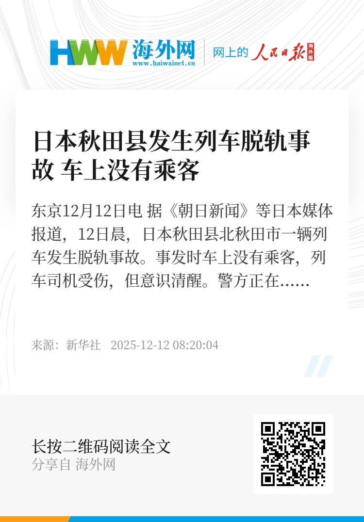 新华社东京12月12日电 据《朝日新闻》等日本媒体报道,12日晨,日本秋田县北秋田市一辆列车发生脱轨事故。事发时车上没有乘客,列车司机受伤,但意识清醒。警方正在调查事故详情。