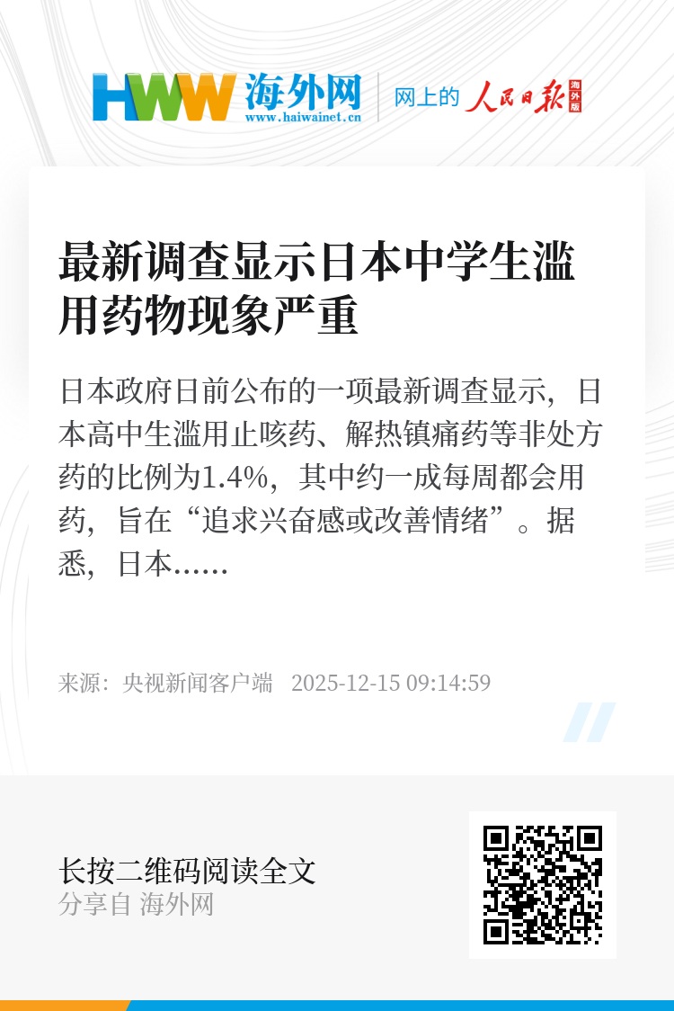 据悉,日本厚生劳动省一个研究小组于2024年9月至2025年2月围绕是否为“追求兴奋感或改善情绪”超量服用非处方药等问题面向高中生开展调查,得出上述结论。调查共收到约5.1万份有效答复。