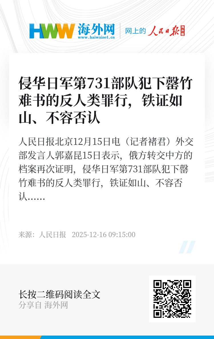 人民日报北京12月15日电(记者褚君)外交部发言人郭嘉昆15日表示,俄方转交中方的档案再次证明,侵华日军第731部队犯下罄竹难书的反人类罪行,铁证如山、不容否认。