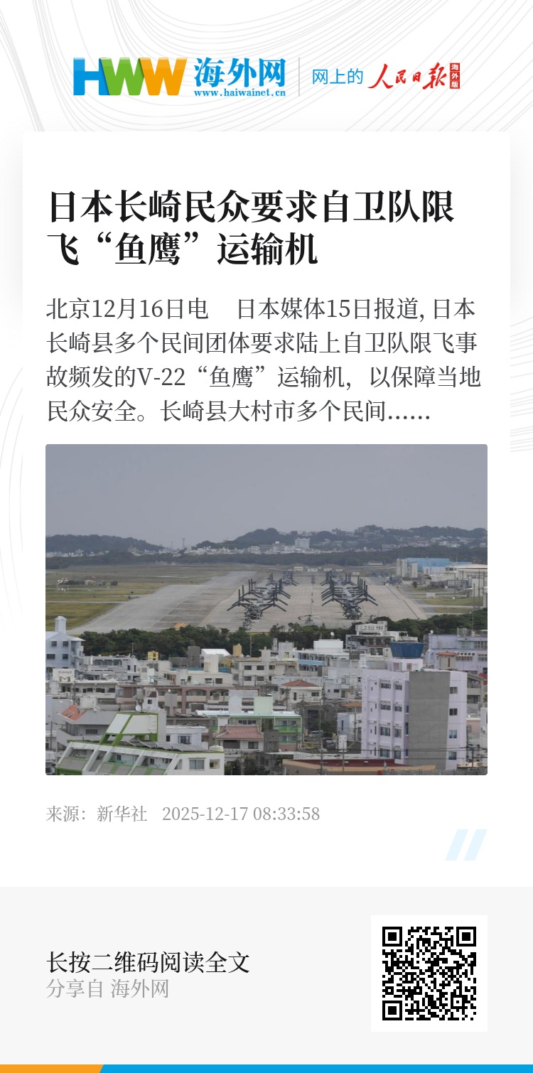 新华社北京12月16日电 日本媒体15日报道,日本长崎县多个民间团体要求陆上自卫队限飞事故频发的V-22“鱼鹰”运输机,以保障当地民众安全。