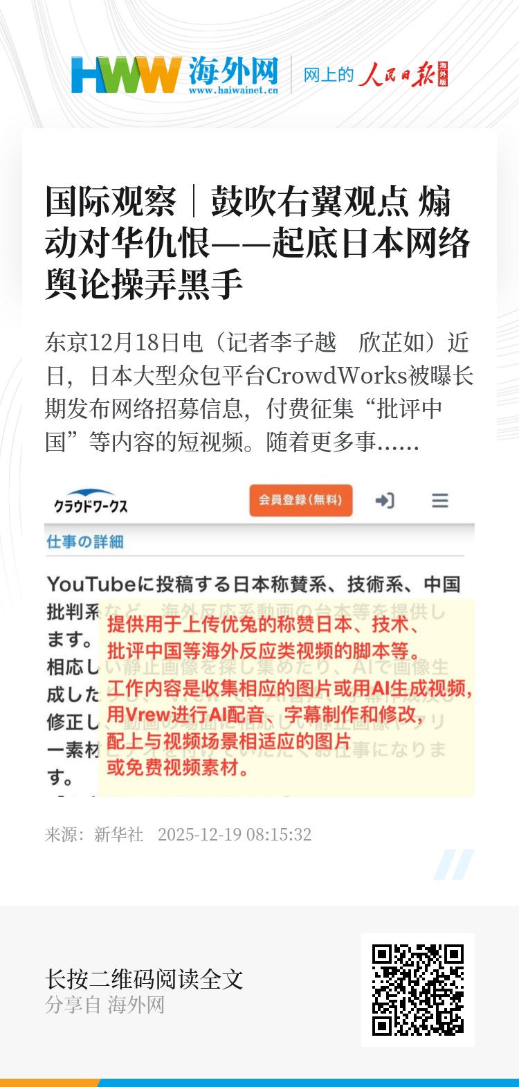 新华社东京12月18日电(记者李子越 欣芷如)近日,日本大型众包平台CrowdWorks被曝长期发布网络招募信息,付费征集“批评中国”等内容的短视频。