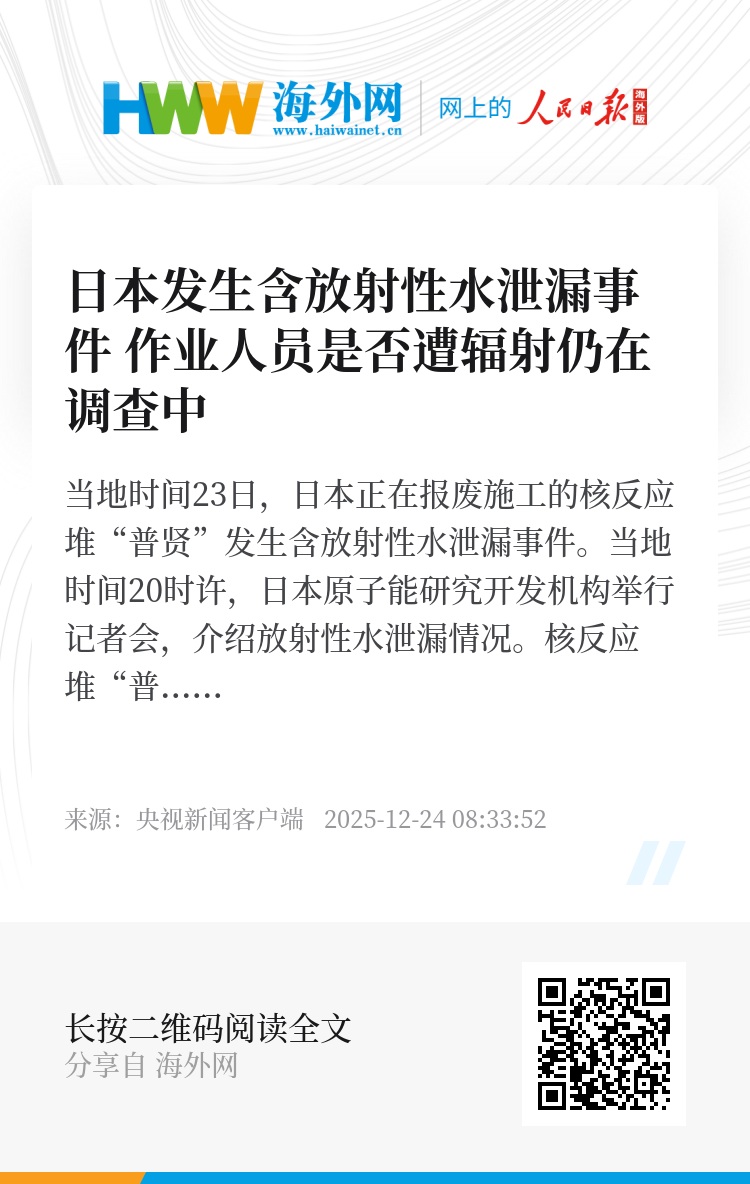 此外,放射性物质并未泄漏至管理区域之外,设施及周边用于测量辐射剂量的监测站点数值未发现异常。(总台记者 何欣蕾 报道员 柏春洋)