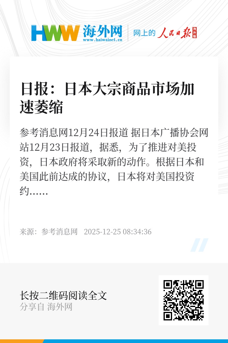 参考消息网12月24日报道 据日本广播协会网站12月23日报道,据悉,为了推进对美投资,日本政府将采取新的动作。根据日本和美国此前达成的协议,日本将对美国投资约80万亿日元。日本贸易保险公司是为日本企业在美业务提供担保的政府相关机构。为强化日本贸易保险公司的财务基础,日本政府正朝着下一年度发行大规模特别国债的方向进行最终调整。有关人士在接受采访时透露了这一消息。