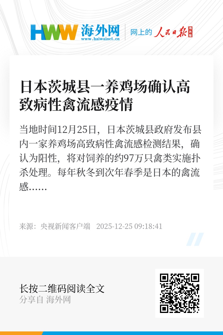当地时间12月25日,日本茨城县政府发布县内一家养鸡场高致病性禽流感检测结果,确认为阳性,将对饲养的约97万只禽类实施扑杀处理。
