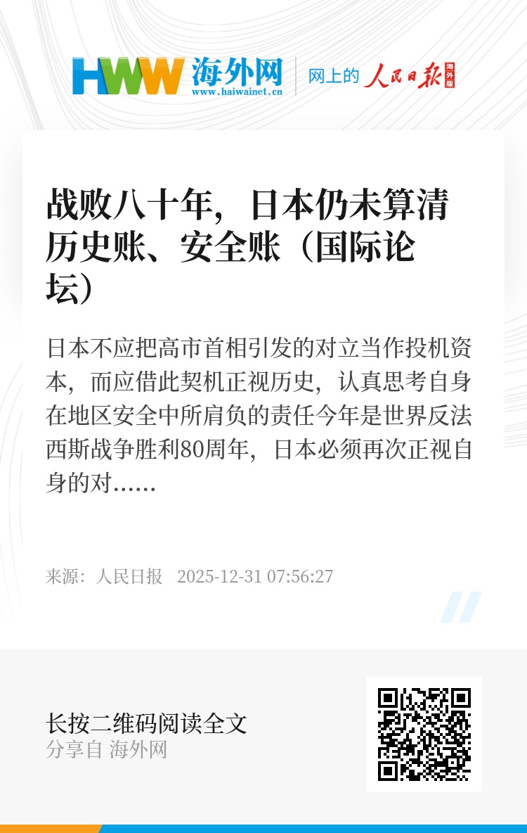 日本不应把高市首相引发的对立当作投机资本,而应借此契机正视历史,认真思考自身在地区安全中所肩负的责任