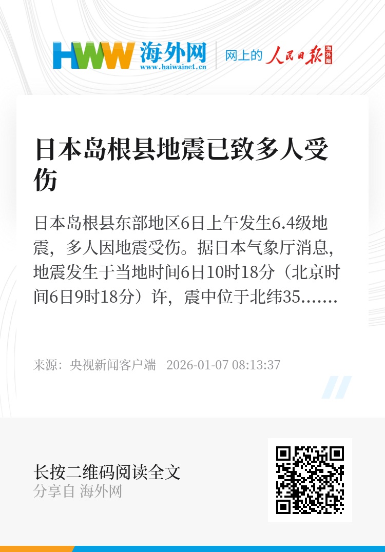 日本岛根县东部地区6日上午发生6.4级地震,多人因地震受伤。