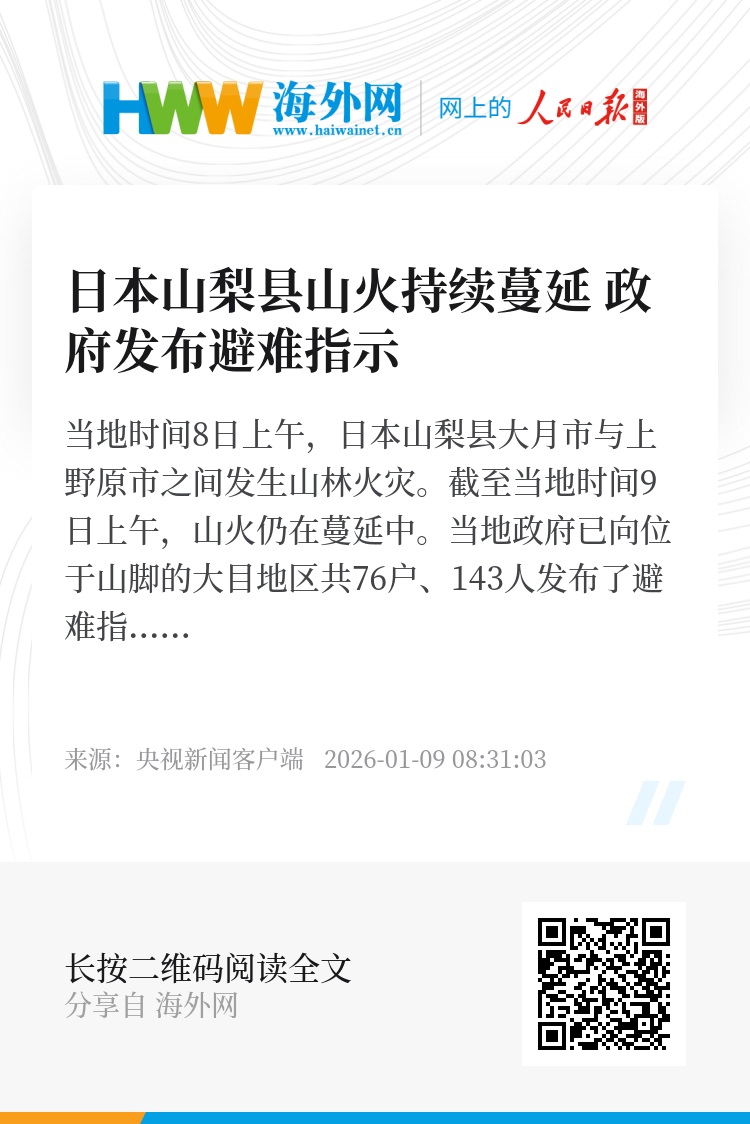 当地时间8日上午,日本山梨县大月市与上野原市之间发生山林火灾。截至当地时间9日上午,山火仍在蔓延中。