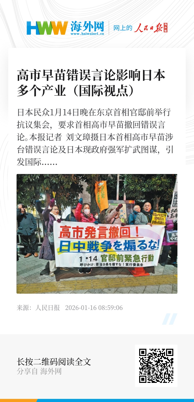 日本首相高市早苗涉台错误言论及日本现政府强军扩武图谋,引发国际社会强烈反对,也对其自身经济社会发展产生一系列负面传导效应。日本旅游业、零售业及金融等多个领域受到直接影响,日本众多工商界人士及民众对经济前景表示担忧,要求高市早苗撤回错误言论,停止危险举措。