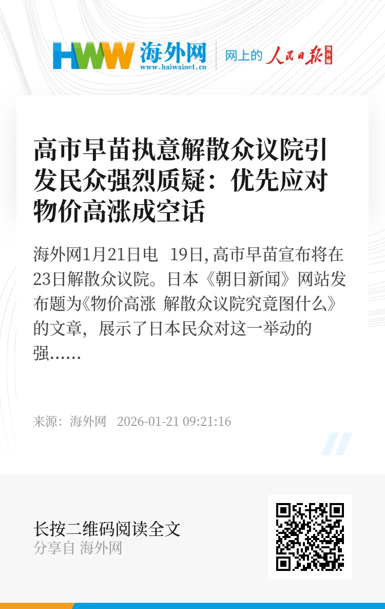 海外网1月21日电 19日,高市早苗宣布将在23日解散众议院。日本《朝日新闻》网站发布题为《物价高涨 解散众议院究竟图什么》的文章,展示了日本民众对这一举动的强烈质疑和不满情绪。