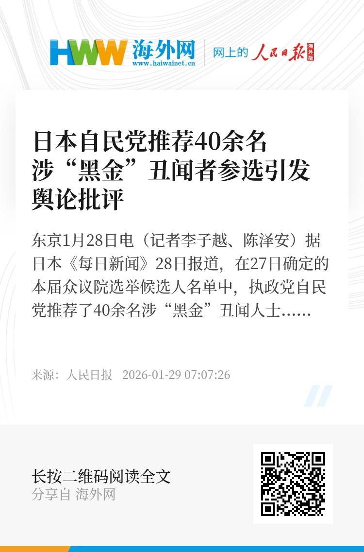新华社东京1月28日电(记者李子越、陈泽安)据日本《每日新闻》28日报道,在27日确定的本届众议院选举候选人名单中,执政党自民党推荐了40余名涉“黑金”丑闻人士作为本党候选人,此举在日本社会引发广泛批评。
