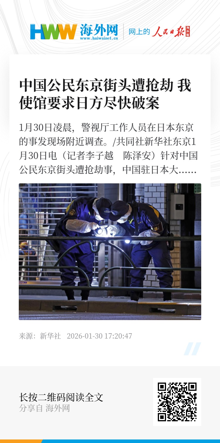 新华社东京1月30日电(记者李子越 陈泽安)针对中国公民东京街头遭抢劫事,中国驻日本大使馆30日说,已向日本警方提出交涉,要求日方尽快破案,切实保护在日中国公民生命财产安全。