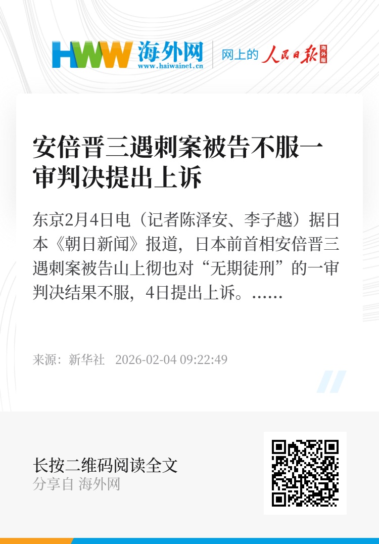 新华社东京2月4日电(记者陈泽安、李子越)据日本《朝日新闻》报道,日本前首相安倍晋三遇刺案被告山上彻也对“无期徒刑”的一审判决结果不服,4日提出上诉。