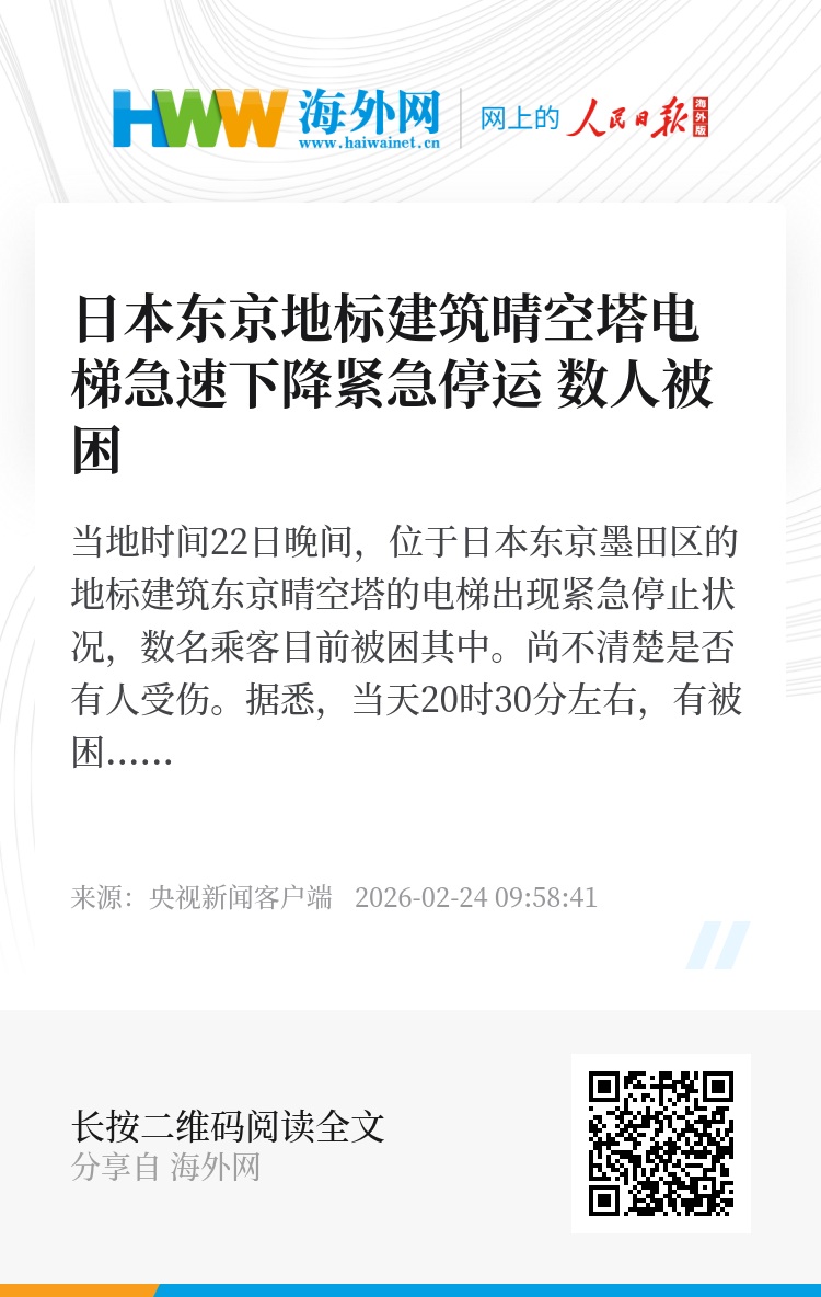 当地时间22日晚间,位于日本东京墨田区的地标建筑东京晴空塔的电梯出现紧急停止状况,数名乘客目前被困其中。尚不清楚是否有人受伤。