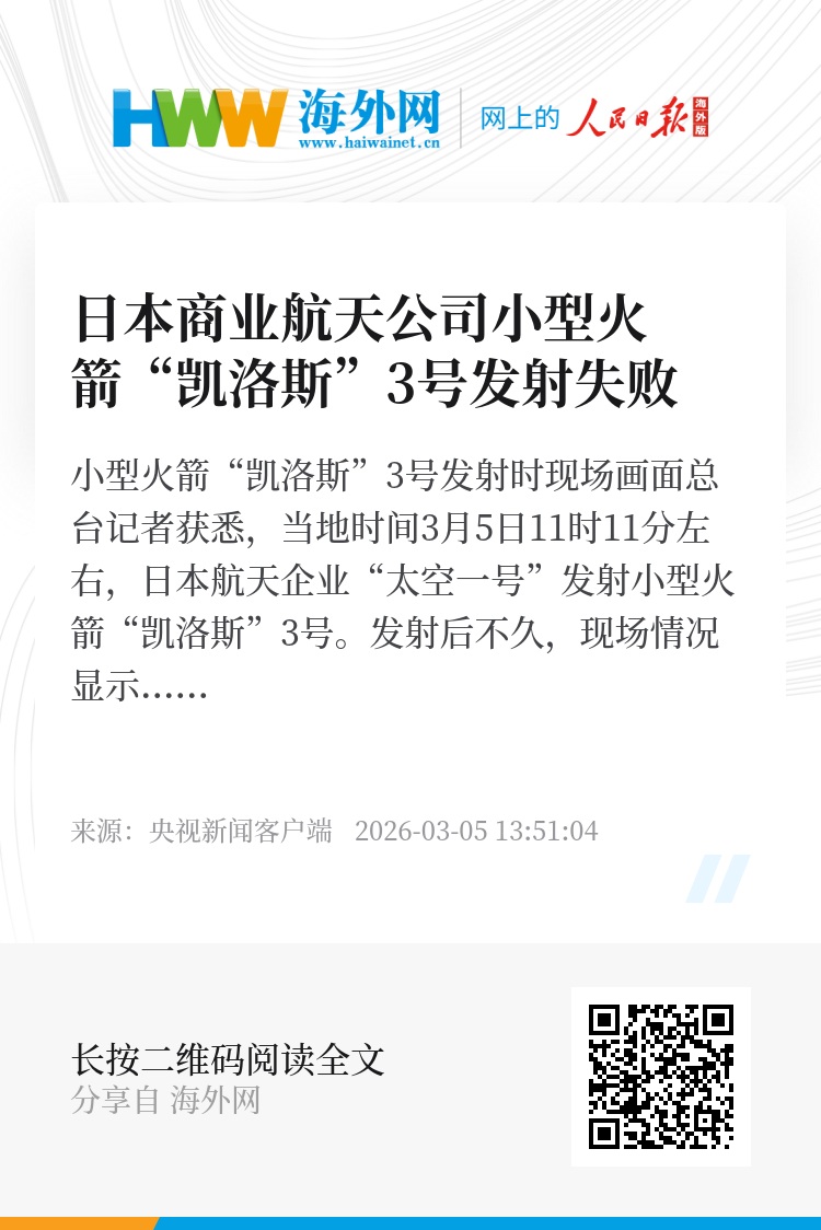 总台记者获悉,当地时间3月5日11时11分左右,日本航天企业“太空一号”发射小型火箭“凯洛斯”3号。