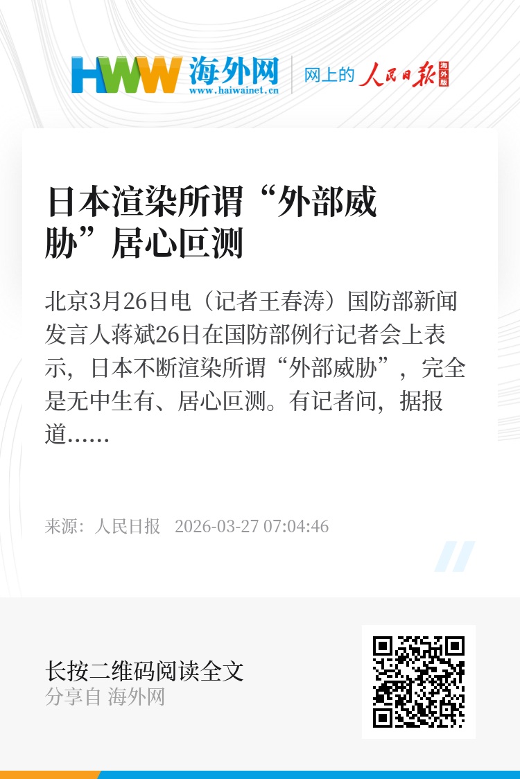 新华社北京3月26日电(记者王春涛)国防部新闻发言人蒋斌26日在国防部例行记者会上表示,日本不断渲染所谓“外部威胁”,完全是无中生有、居心叵测。