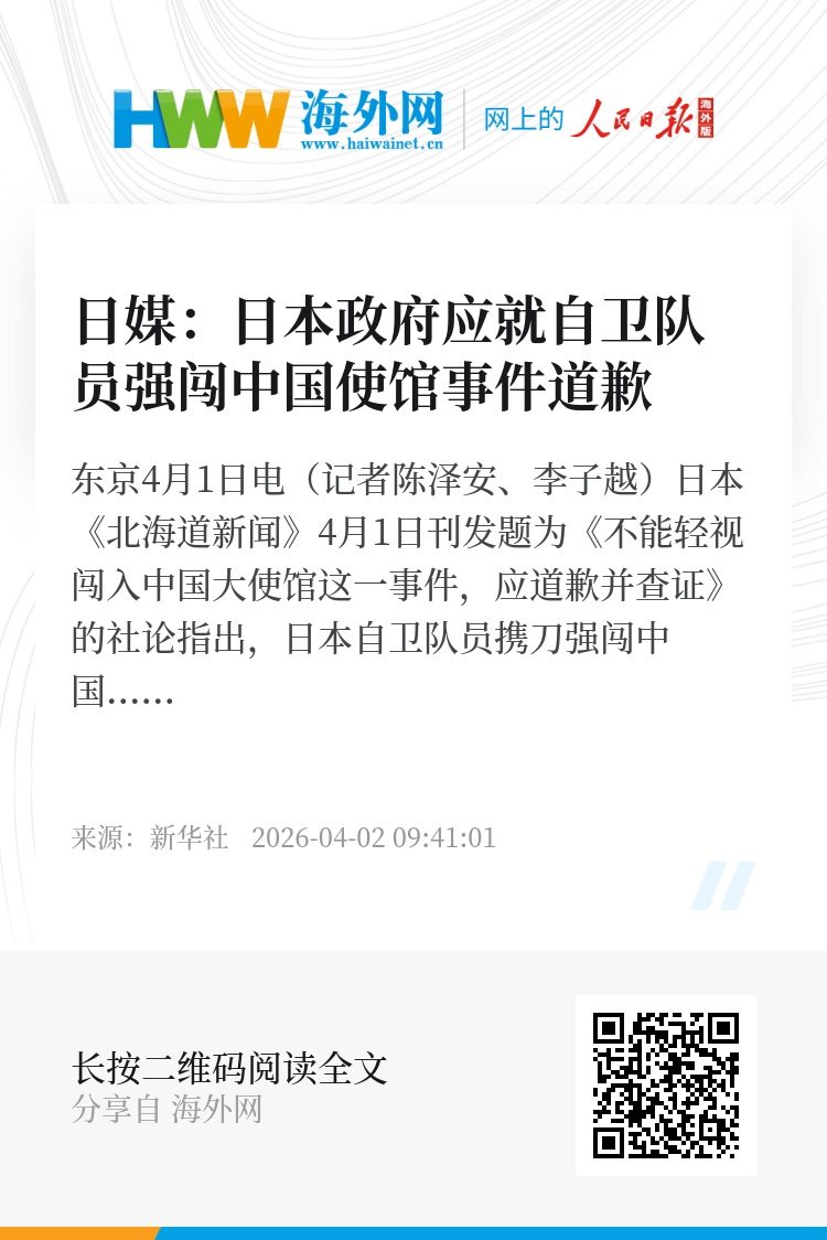 新华社东京4月1日电(记者陈泽安、李子越)日本《北海道新闻》4月1日刊发题为《不能轻视闯入中国大使馆这一事件,应道歉并查证》的社论指出,日本自卫队员携刀强闯中国大使馆是严重事件,日本政府应明确道歉并详细调查原委。文章摘要如下: