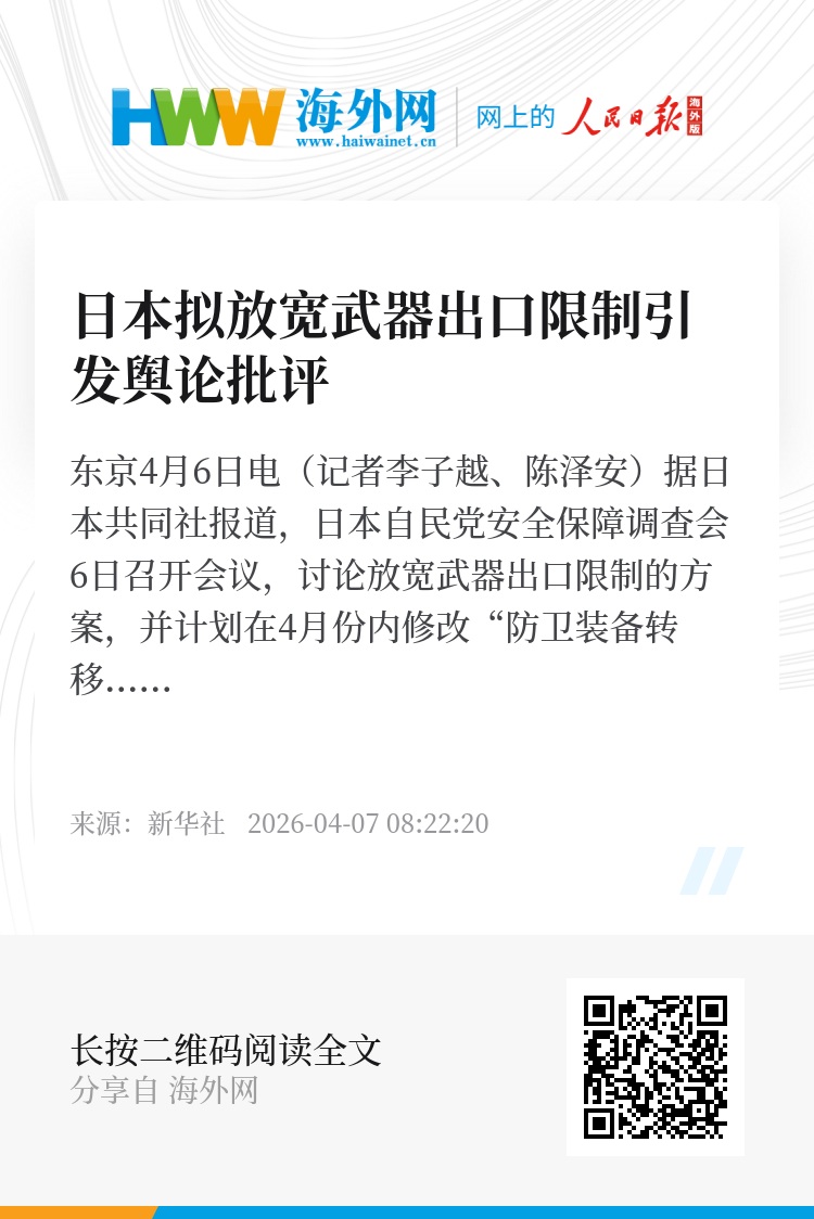 新华社东京4月6日电(记者李子越、陈泽安)据日本共同社报道,日本自民党安全保障调查会6日召开会议,讨论放宽武器出口限制的方案,并计划在4月份内修改“防卫装备转移三原则”及其运用指南,为武器出口“松绑”。此举引发日本国内舆论批评。
