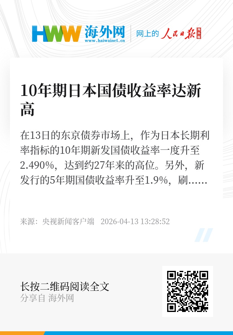 在13日的东京债券市场上,作为日本长期利率指标的10年期新发国债收益率一度升至2.490%,达到约27年来的高位。另外,新发行的5年期国债收益率升至1.9%,刷新历史最高水平。