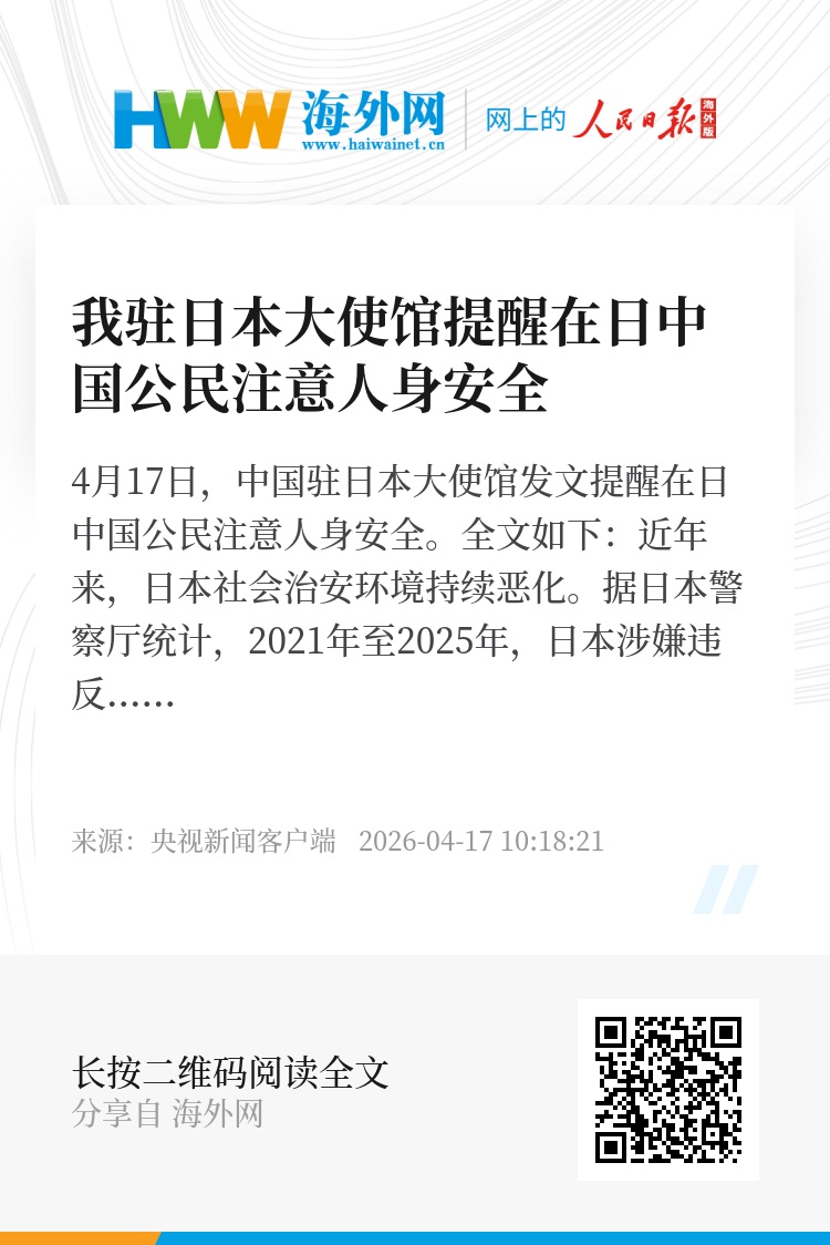 4月17日,中国驻日本大使馆发文提醒在日中国公民注意人身安全。全文如下: