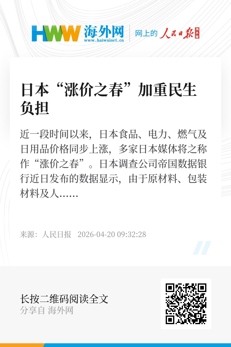 近一段时间以来,日本食品、电力、燃气及日用品价格同步上涨,多家日本媒体将之称作“涨价之春”。日本调查公司帝国数据银行近日发布的数据显示,由于原材料、包装材料及人工成本持续攀升,日本195家主要食品和饮料生产商计划上调产品定价,涉及商品多达2798种。这是2026年以来单月涨价商品首次突破2000种。同时,日本电费、燃气费的政府补贴已到期,10家大型电力企业和4家城市燃气企业全面上调收费标准。一户日本普通家庭每月电费预计增加393至463日元(1元人民币约合23日元),燃气费增加148至195日元。