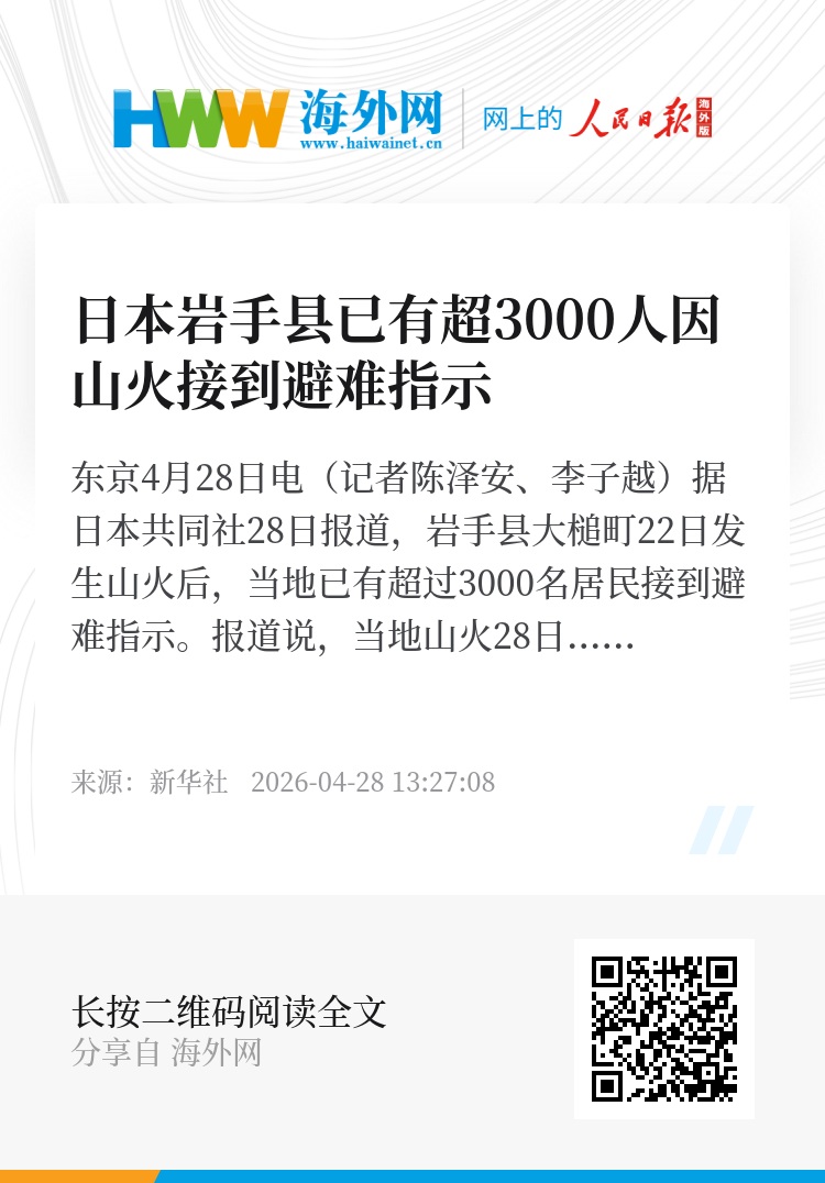 新华社东京4月28日电(记者陈泽安、李子越)据日本共同社28日报道,岩手县大槌町22日发生山火后,当地已有超过3000名居民接到避难指示。
